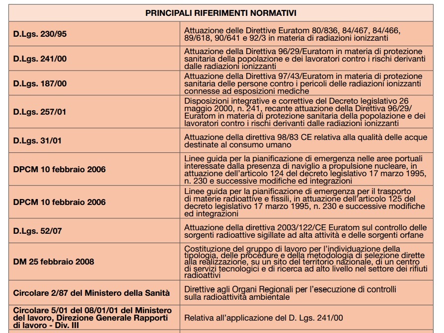 I concetti di dosimetria e le definizioni delle grandezze dosimetriche per usi in protezione sono definiti dall' ICRP (International Commission for Radiation Protection) e dall' ICRU (International Commission on Radiation Units and measurements). La principale fonte legislativa italiana sulla radioprotezione è il Dlgs 230/95 e successive revisioni ( Dlgs 241/00)che, a livello scientifico, si basa sulla Raccomandazioni ICRP 60/1990; nel 2007 è stata rilasciata dall'ICRP una nuova raccomandazione (Pubblicazione 103) che riprende alcuni punti della ICRP 60 integrandola.